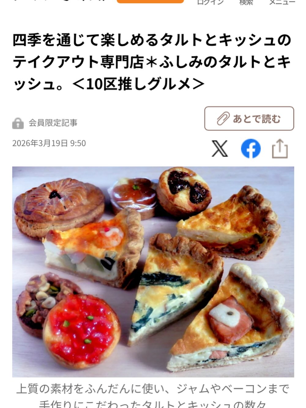 . こんばんは。 本日もご来店いただきまして ありがとうございました。 営業時間中にキッシュが売り切れてしまい ご希望の商品をお買い求め頂けなかった お客さまにはご迷惑をおかけしました。 お取り置きも可能ですので どうぞお気軽にお問合せください。 DM、お電話で承っております。 DMの場合、気づくのにお時間頂くこともございます。 ご了承頂けますと幸いです。 北海道新聞さまのデジタル版 【10区推しグルメ】のコーナーで 当店をご紹介して頂きました。 ありがとうございました! 明日はキッシュ5〜6種、タルト12種ご用意して 皆さまのお越しをお待ちしております! どうぞよろしくお願い致します^^